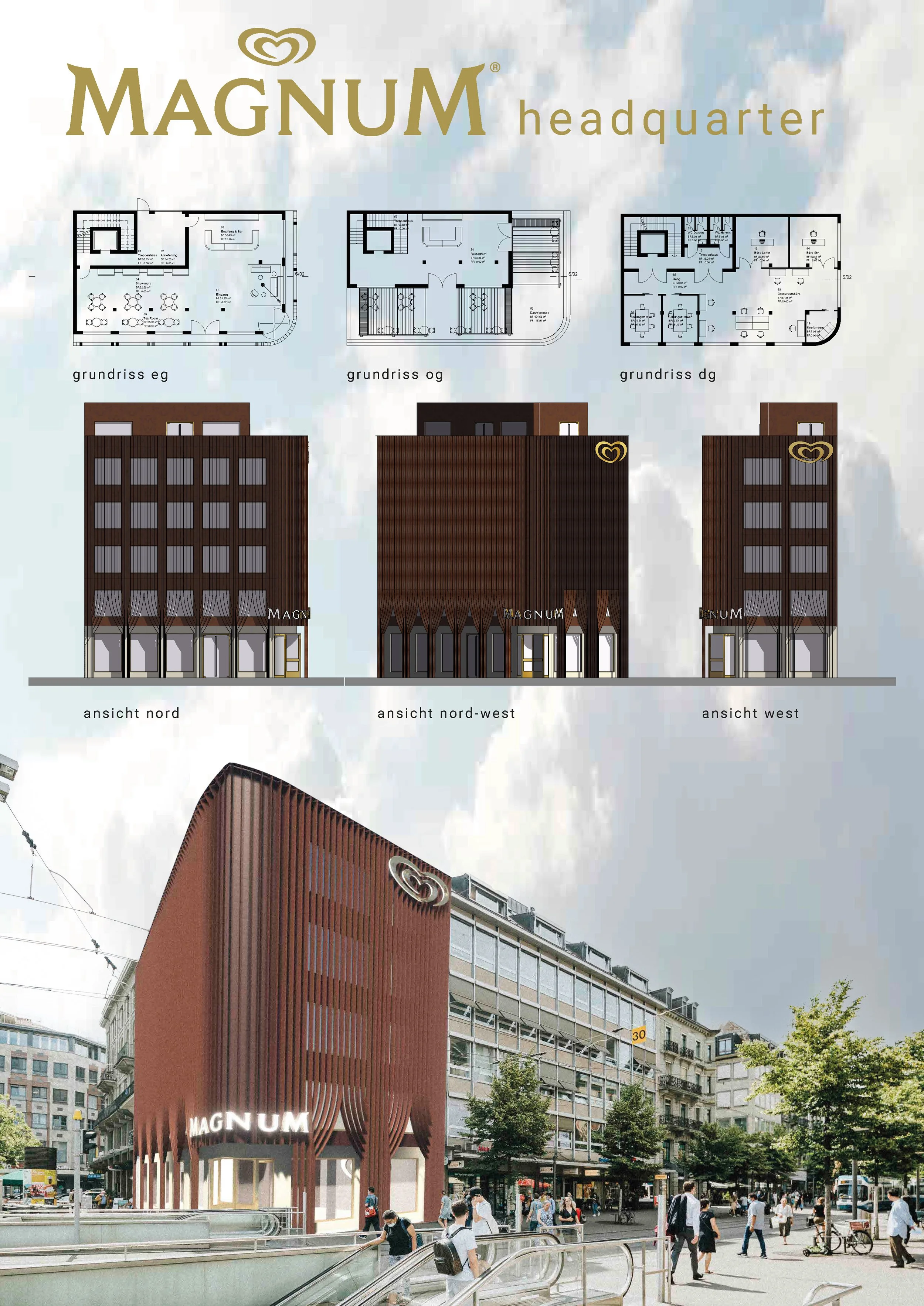 Im Modul CAAD/BIM 2 ging es darum, ArchiCAD vertieft kennenzulernen und die BIM-Funktionen anzuwenden. Die Abschlussaufgabe war frei in der Gestaltung und bot Raum für ein individuelles Projekt. Ich entwarf das Magnum Headquarter an der Zürcher Bahnhofstrasse mit Empfang und Café im Erdgeschoss, Büroflächen in den Obergeschossen sowie einer Rooftop Bar. Der Entwurf wurde in Archicad modelliert und visualisiert und anschliessend mit Photoshop realistisch in den städtischen Kontext eingefügt.