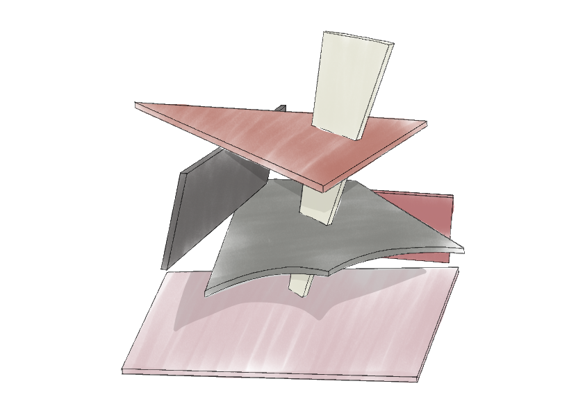 Im Modul Farbe entstand ein architektonisches Modell auf Grundlage des Gemäldes Painterly Architectonic von Liubov Popova (1917). Die strengen, farbigen Geometrien des Bildes dienten als Inspiration für eine skulpturale Übersetzung in den Raum. Grossflächige Elemente wurden als Decken interpretiert, getragen von Wänden in Schwarz, Bordeaux und Weiss. Zur Stabilisierung überkragender Flächen kamen zusätzliche Stützen zum Einsatz. So entwickelte sich ein Modell, das sowohl Innenräume als auch differenzierte Aussenbereiche erfahrbar macht.